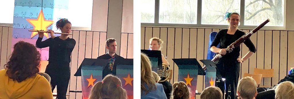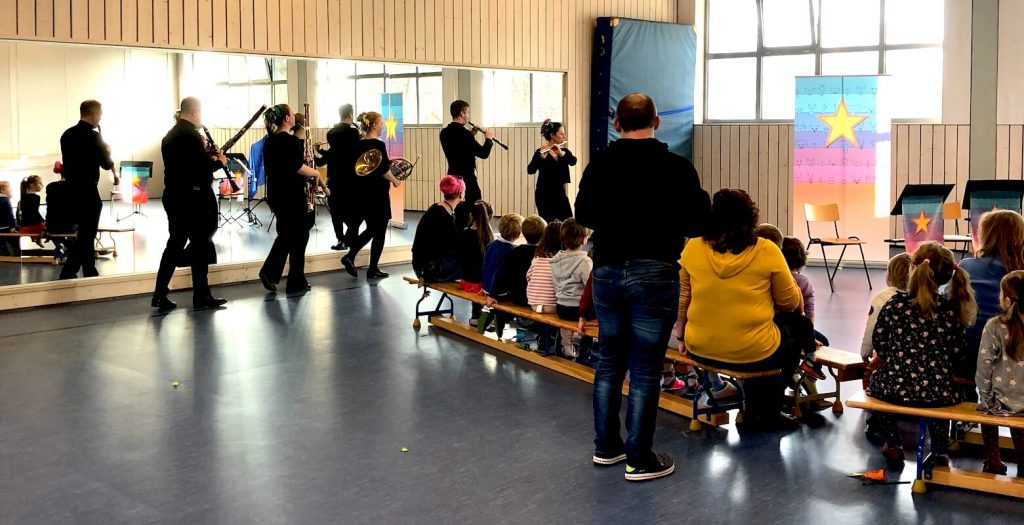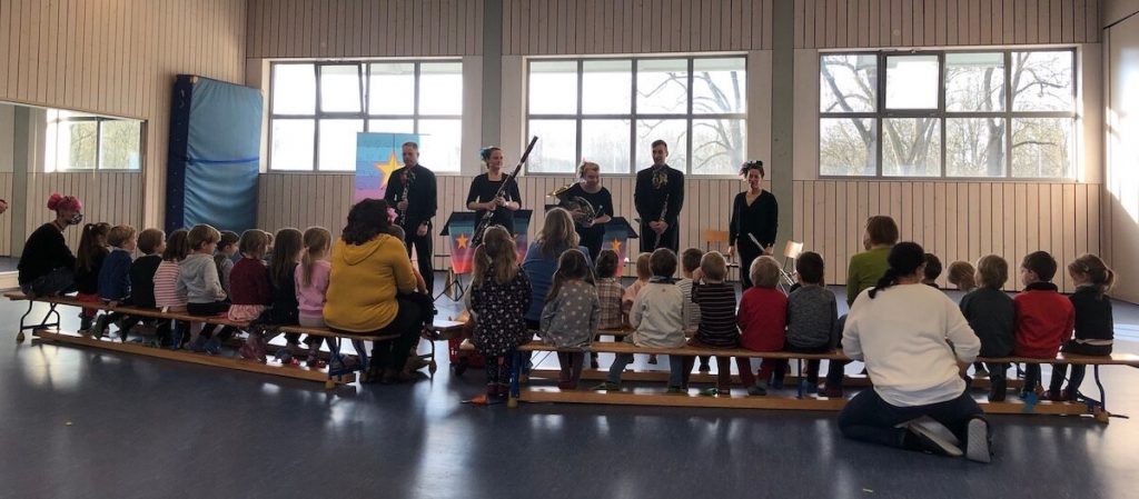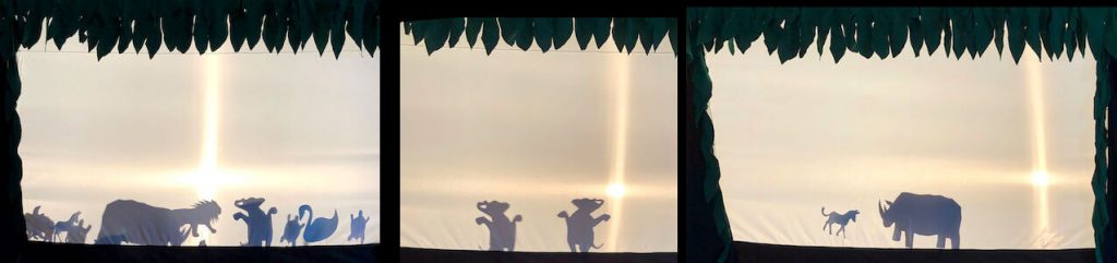 Tags darauf gab es den krönenden Abschluss: Das Staatstheater Augsburg spielte den Kindern die Geschichte nochmals aus der Perspektive der Musikinstrumente vor, die rhythmisch, melodisch und lautmalerisch die einzelnen Charaktere der Tiere herausstellten. So konnten dieses Mal auch unsere »Schattentheater-Schauspieler« die Geschichte als Zuseher und Zuhörer genießen.